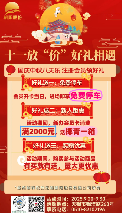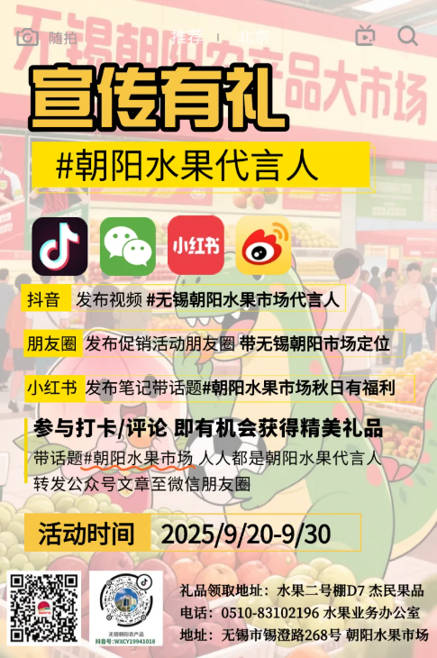 國慶旗將紅,中秋月漸圓! 雙節(jié)同慶的熱鬧里, 怎么少得了新鮮水果的甜? 朝陽水果批發(fā)市場 雙節(jié)專屬促銷已上線, 為你的團(tuán)圓宴、走親禮 備好滿滿 “果” 力!           想給家人朋友送心意?市場能定制水果禮盒! 挑好新鮮菜果,搭配成盒,體面又健康! 中秋走親戚、國慶訪好友,拎著超有范兒。 而且市場早早就為雙節(jié)做足準(zhǔn)備,不僅新增了清晰的引導(dǎo)標(biāo)識,還掛滿了鮮艷的紅旗與節(jié)日橫幅,紅綢隨風(fēng)飄動,果香伴著喜慶,一進(jìn)市場就能感受到濃濃的雙節(jié)氛圍,采購時連心情都跟著熱鬧起來! 這個雙節(jié),囤新鮮、享優(yōu)惠、送好禮,就來朝陽農(nóng)產(chǎn)品大市場,讓新鮮菜果,把節(jié)日氛圍拉滿! (供稿:張柯宇) |